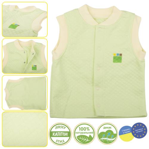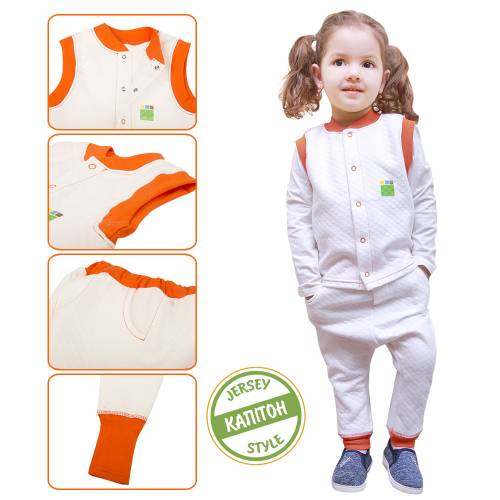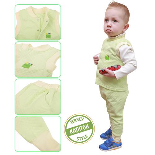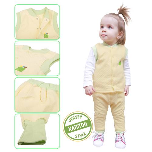 Трикотажний жилет Jersey Slyle виробляється з високоякісних натуральних матеріалів, ніжного та м'якого стьобаного трикотажу «Капітон» (100% бавовна). Капітон - натуральне тришарове трикотажне полотно з ефектом стежки у вигляді ромбу або квадрату. На дотик капітон більш м'який, ніжний та об'ємний матеріал, ніж футер. Завдяки структурі та натуральному складу, трикотажна тканина вільно пропускає повітря, що дозволяє шкірі дитини «дихати». Костюм Jersey Style зберігає стабільний тепловий баланс, зігріває малюка протягом дня, надає затишок та комфорт в холодну погоду. Шкіра малюка контактує тільки з натуральними матеріалами, не пріє та не викликає алергічні реакції.